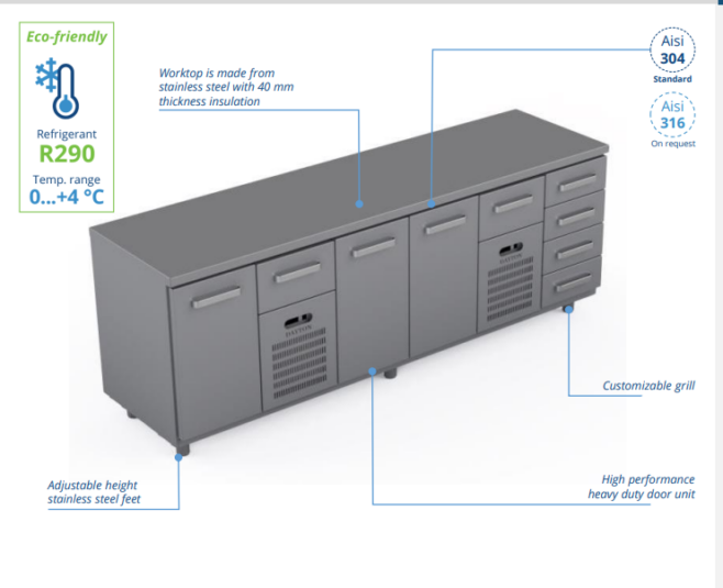 Kølebord med låger og 6 skuffer 2400x660x900