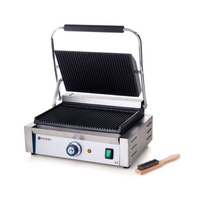 Løft topgrillen med det varmebestandige håndtag og lås i enhver position takket være den fjederbelastede mekanisme.