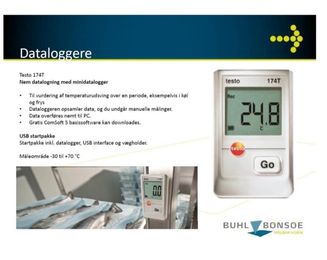 Den lille Testo 174T datalogger er ideel til målinger i køle- og opbevaringsrum, under transport og produktion samt mange andre applikationer. Testo 174 dataloggeren overholder EN 12830.